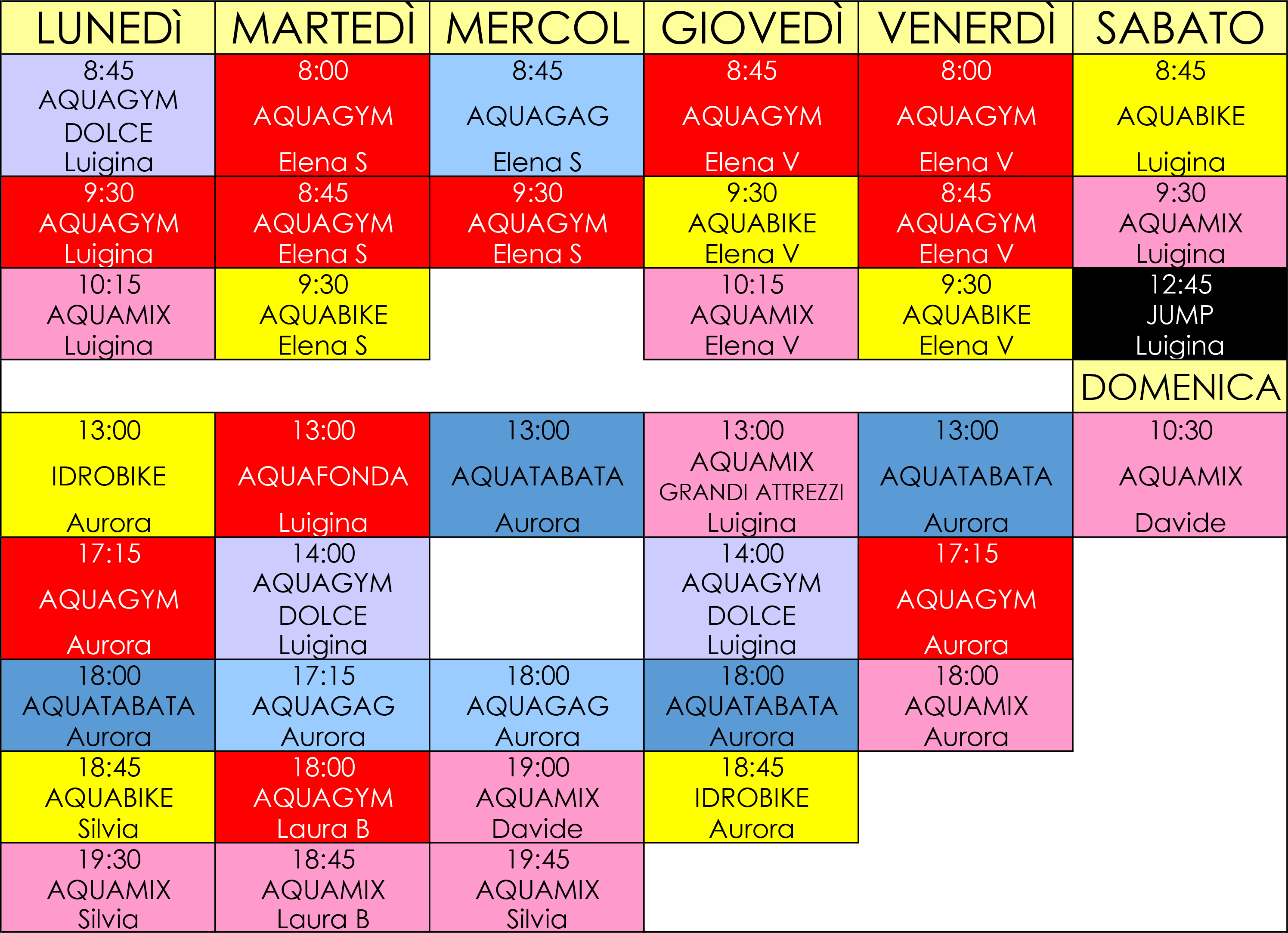 - AQUAMIX: attività che prevede la rotazione di tutte le diverse discipline dell'aquafitness per dare un allenamento vario. Ogni volta una lezione diversa.