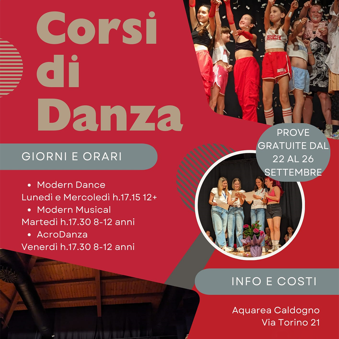 Categorie News Aquarea Partecipa ai corsi di Danza! Autore articolo Di admin Data dell'articolo Settembre 24, 2025 Venite a scoprire la magia della danza grazie ai nostri corsi!✨️ 🩰 Modern Dance ️ lunedì e mercoledì - ore 17:15 🩰 Modern Musical ️ martedì - ore 17:30 🩰 Acrodanza ️ venerdì - ore 17:30 📍 corsi attivi presso l'impianto di Caldogno 📍 Info e iscrizioni in segreteria 📝 Vi aspettiamo numerosi!